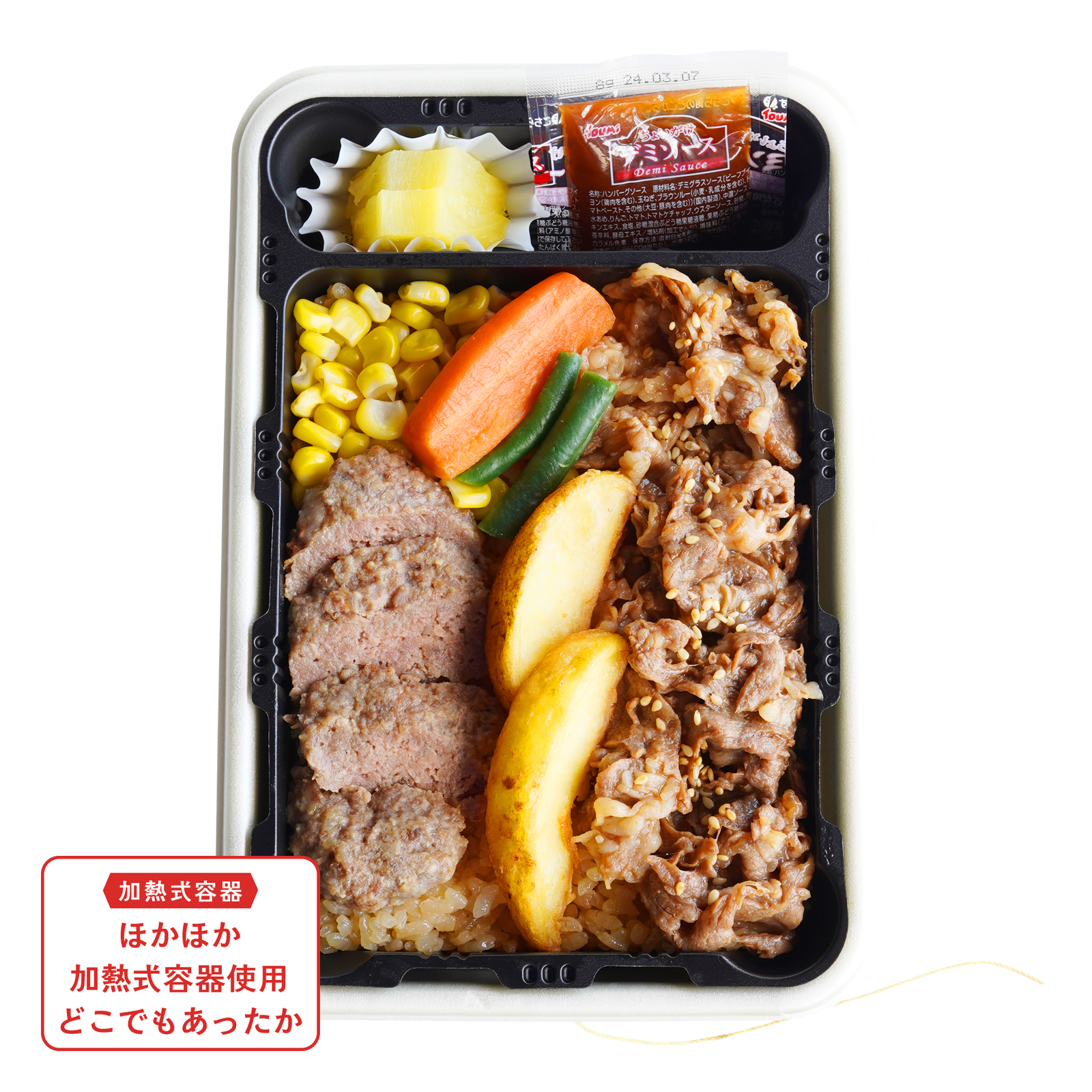 味付けご飯、近江牛焼肉、ハンバーグ、コーン、いんげん煮、人参煮、フライドポテト、パインアップル、デミグラスソース
