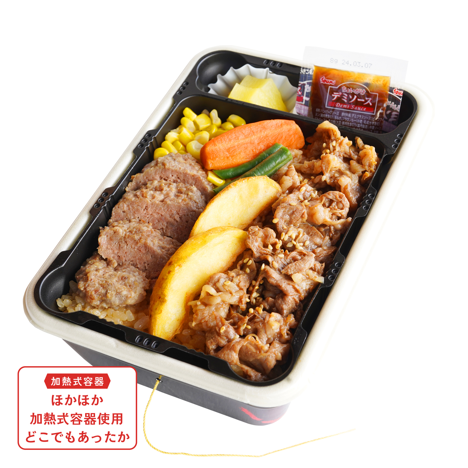 牛肉二大料理の「焼肉」「ビーフハンバーグ」を一度に味わえるお弁当。