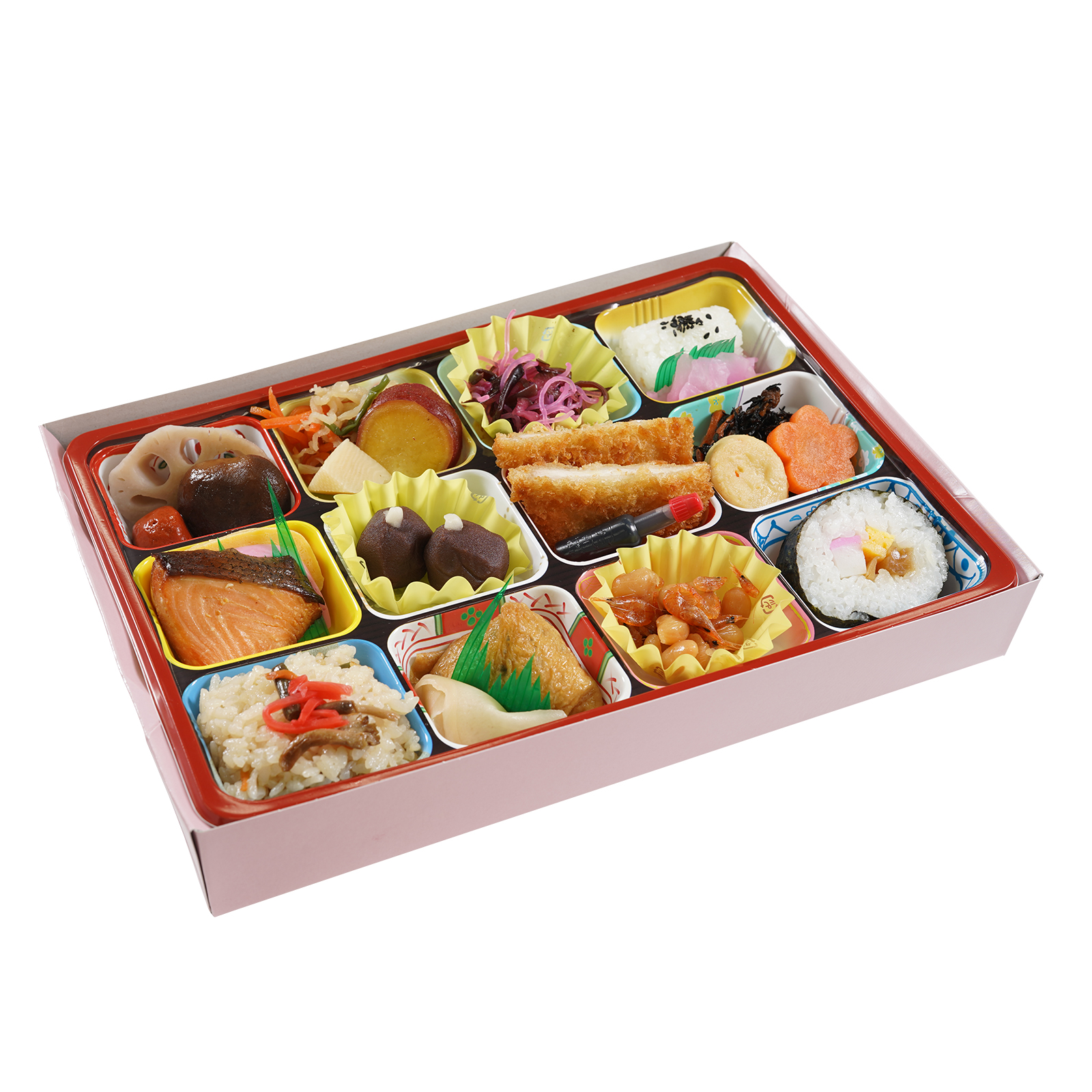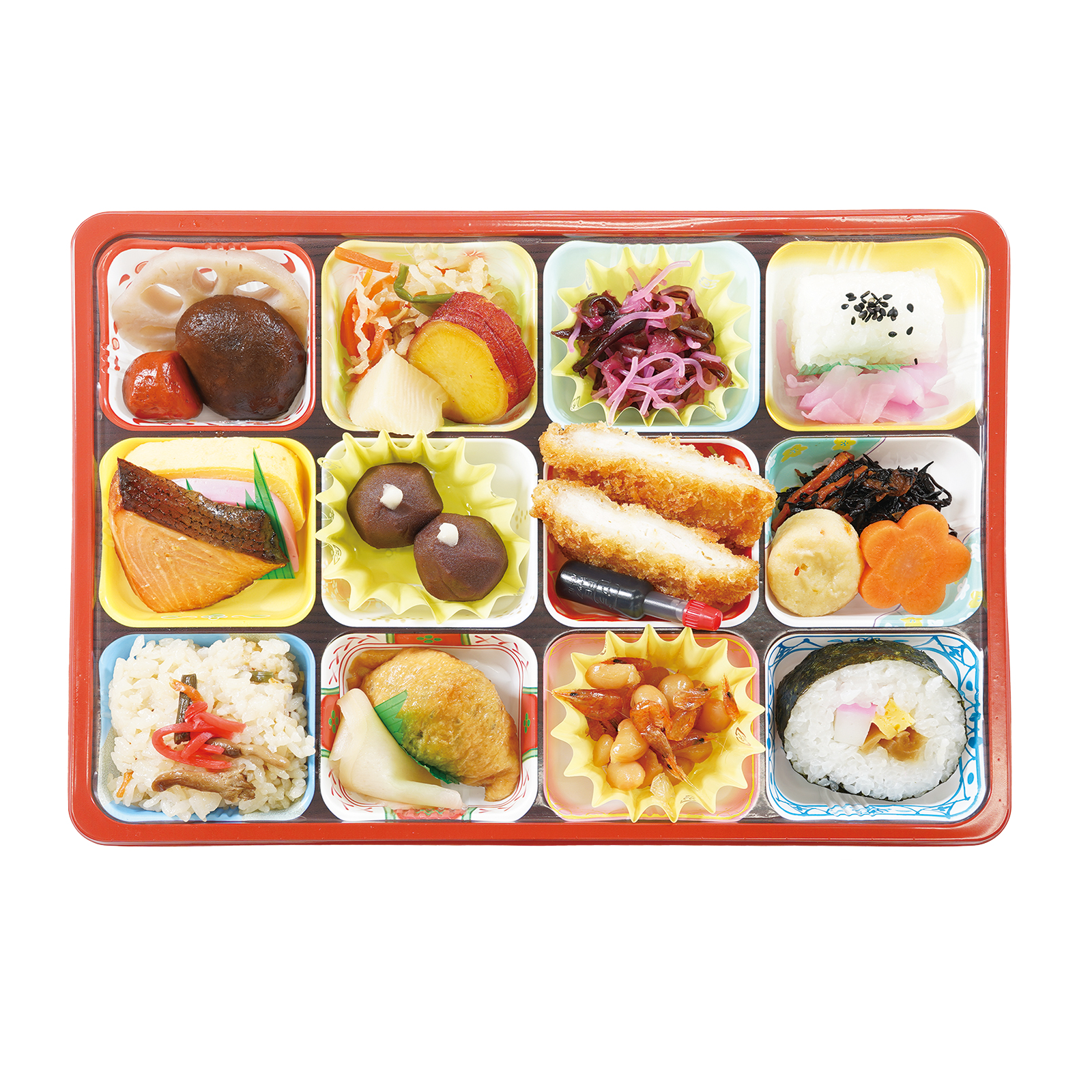 巻き寿司、いなり寿司、山菜ごはん、白ご飯(黒胡麻)、チキンカツ、焼鮭、だし巻、蒲鉾、切干大根、さつまいも甘露煮、筍煮、れんこん煮、椎茸煮、赤玉蒟蒻煮、ひじき煮、がんもどき煮、花人参、紅梅春雨、白生姜、海老豆、さくら漬、うばがもち