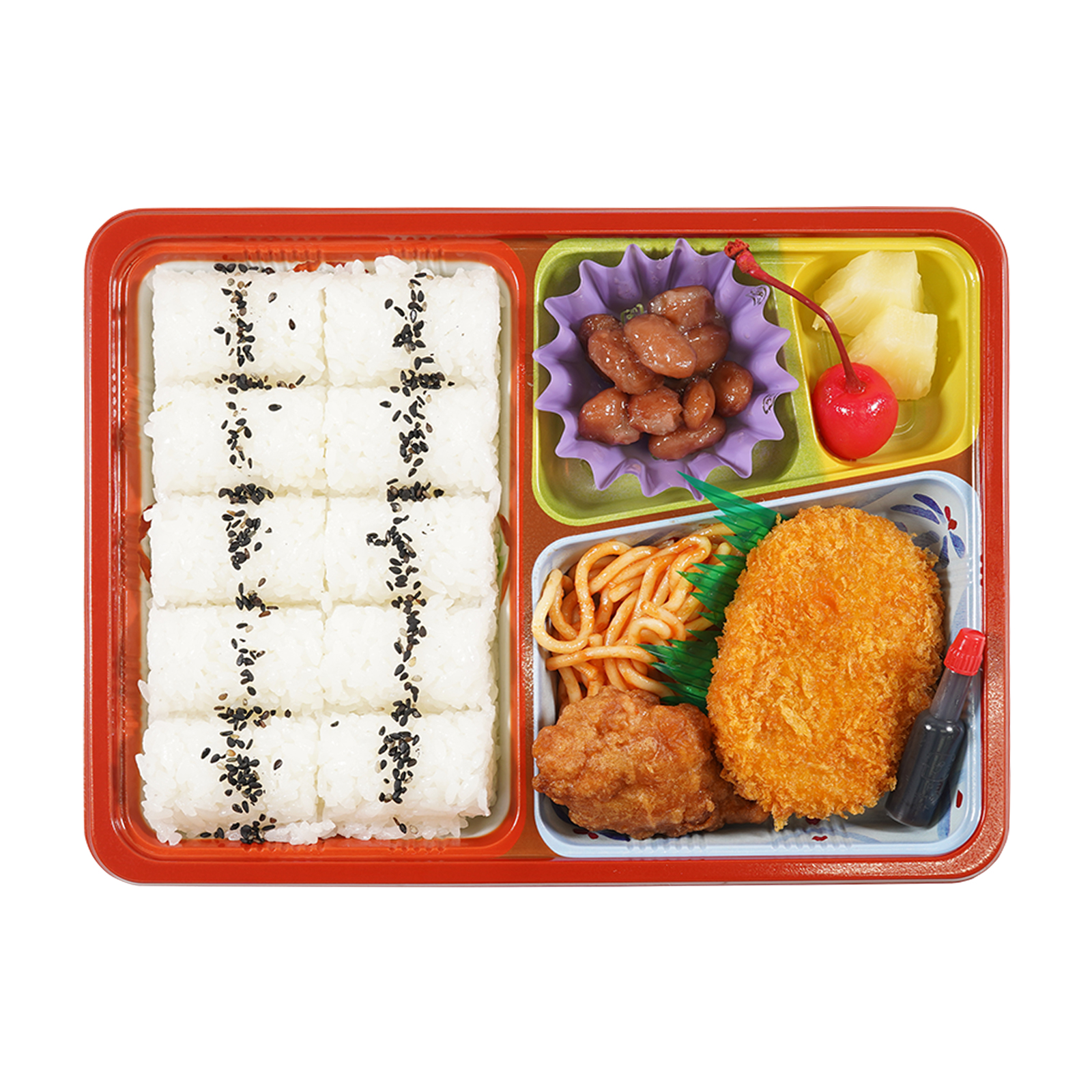 白ご飯(黒胡麻)、コロッケ、鶏唐揚げ、イタリアンスパゲッティ、金時豆、フルーツ(チェリー・パイン)