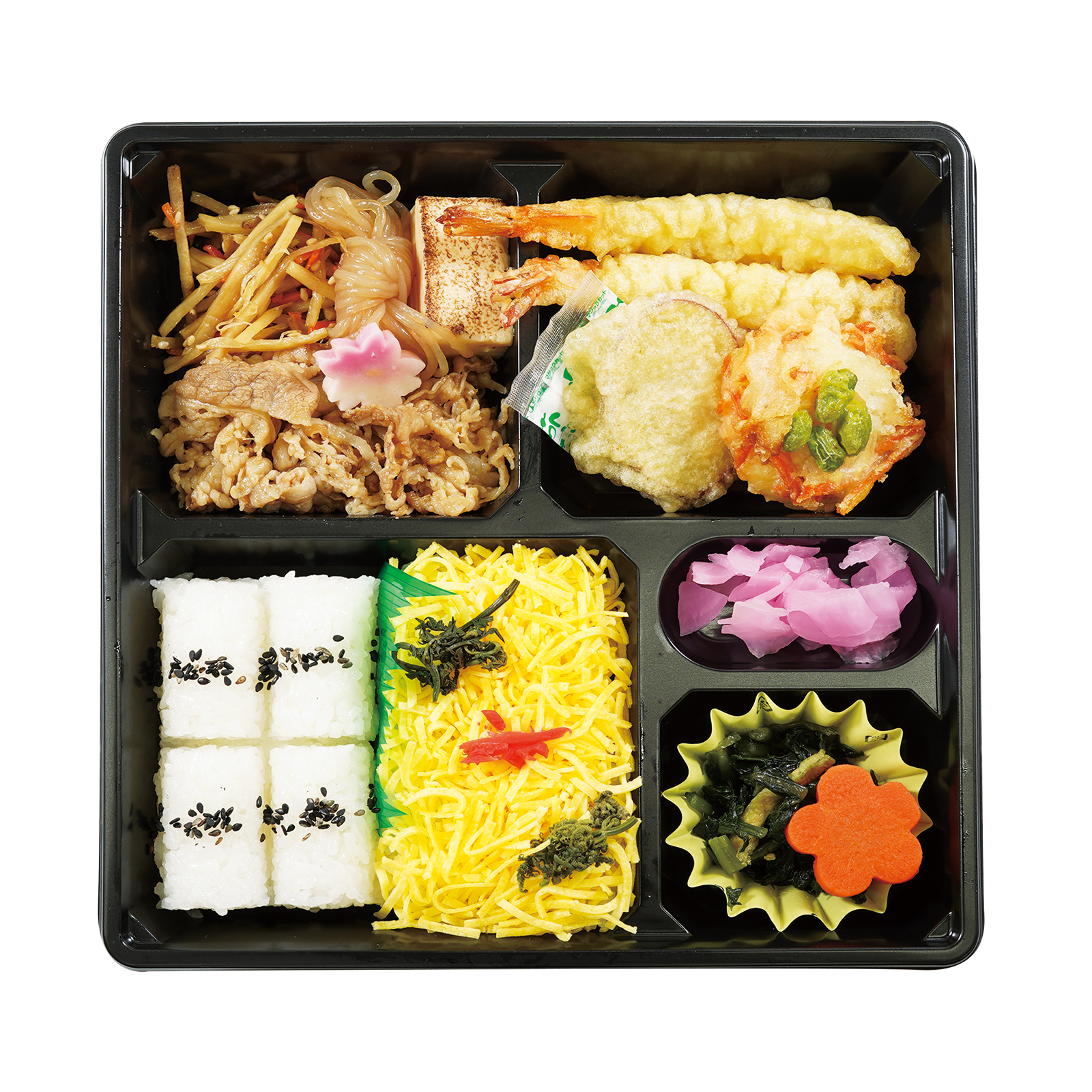 ちらし寿司、白ご飯(黒胡麻)、牛肉しぐれ煮、金平牛蒡、蒟蒻煮、焼豆腐煮、花麩、海老天麩羅、甘芋天麩羅、三食野菜とすり身の落とし揚げ、大根葉油揚げ、花人参、さくら漬