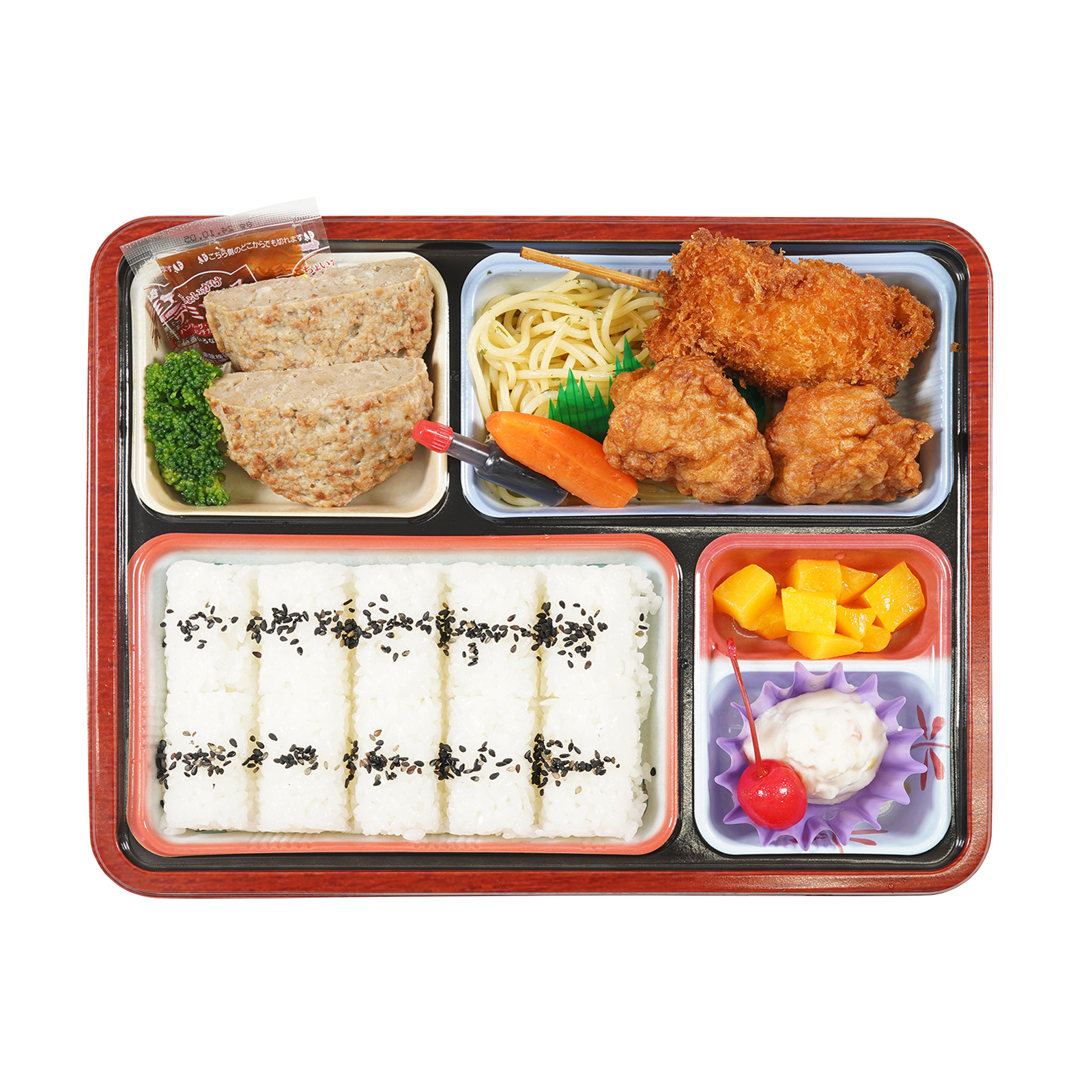 白ご飯(黒胡麻)、豚玉ねぎ串カツ、鶏唐揚げ、ペペロンチーノ、ハンバーグ(デミソース付)、ブロッコリー煮、人参煮、ポテトサラダ、フルーツ(チェリー・黄桃)