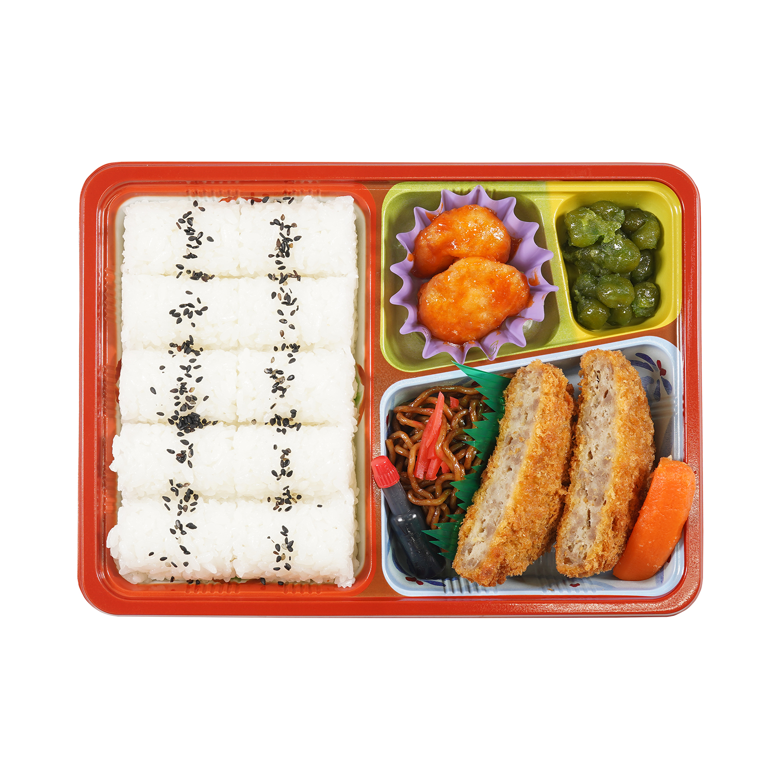 白ご飯(黒胡麻)、ミンチカツ、焼きそば、エビチリ、人参煮、うぐいす豆
