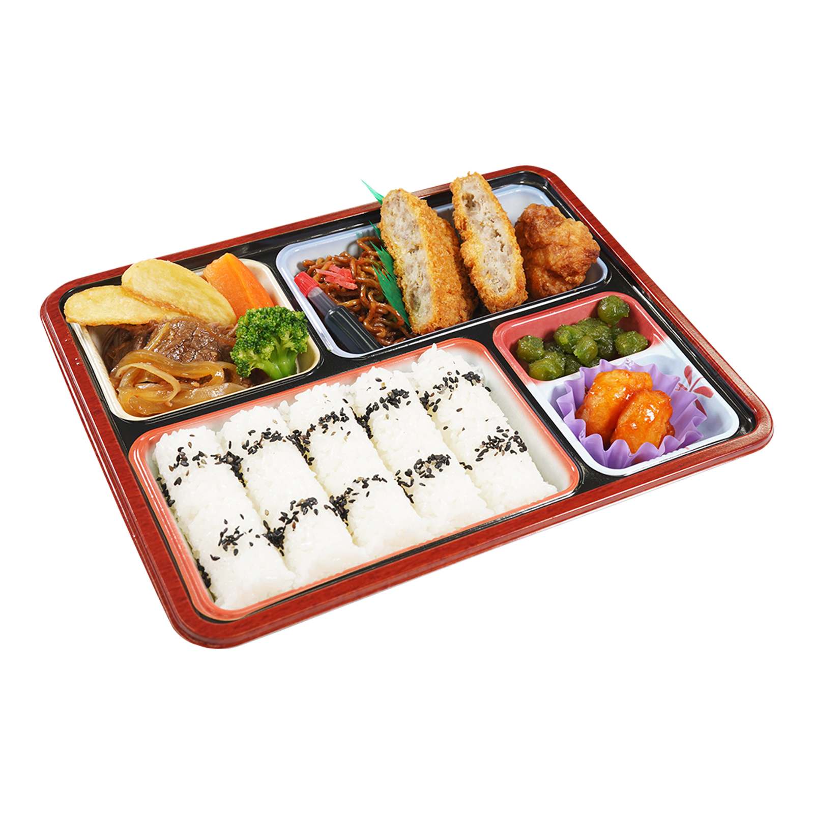 白ご飯(黒胡麻)、ミンチカツ、鶏唐揚げ、焼きそば、焼肉、ナチュラルカットポテト、ブロッコリー煮、人参煮、エビチリ、うぐいす豆