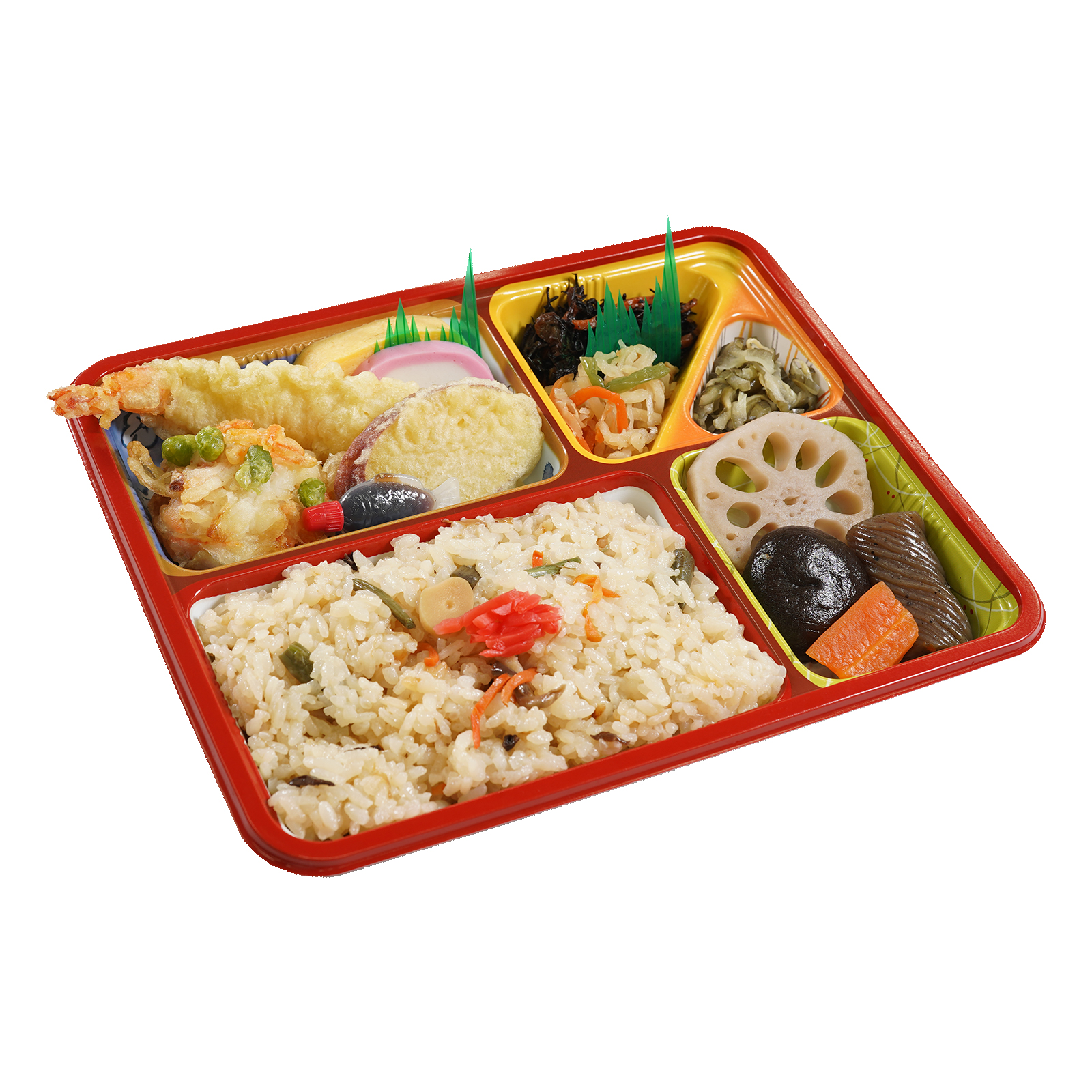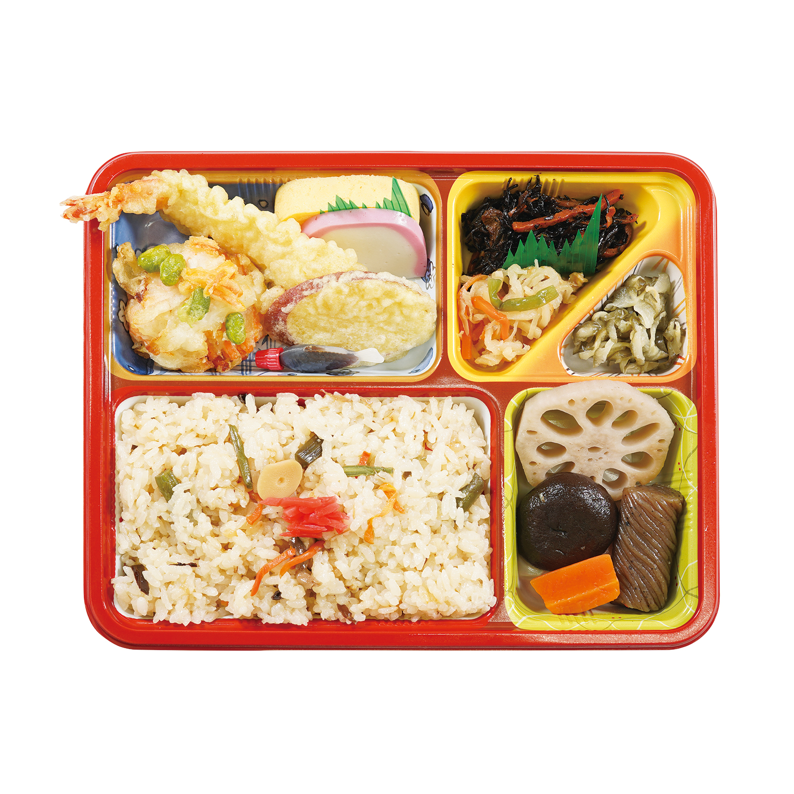 さつまいもの天ぷら、三色野菜とすり身の落とし揚げ、のばし海老の天ぷらの3種の天ぷらをメインに、山菜ごはんを盛りつけた和風弁当です。