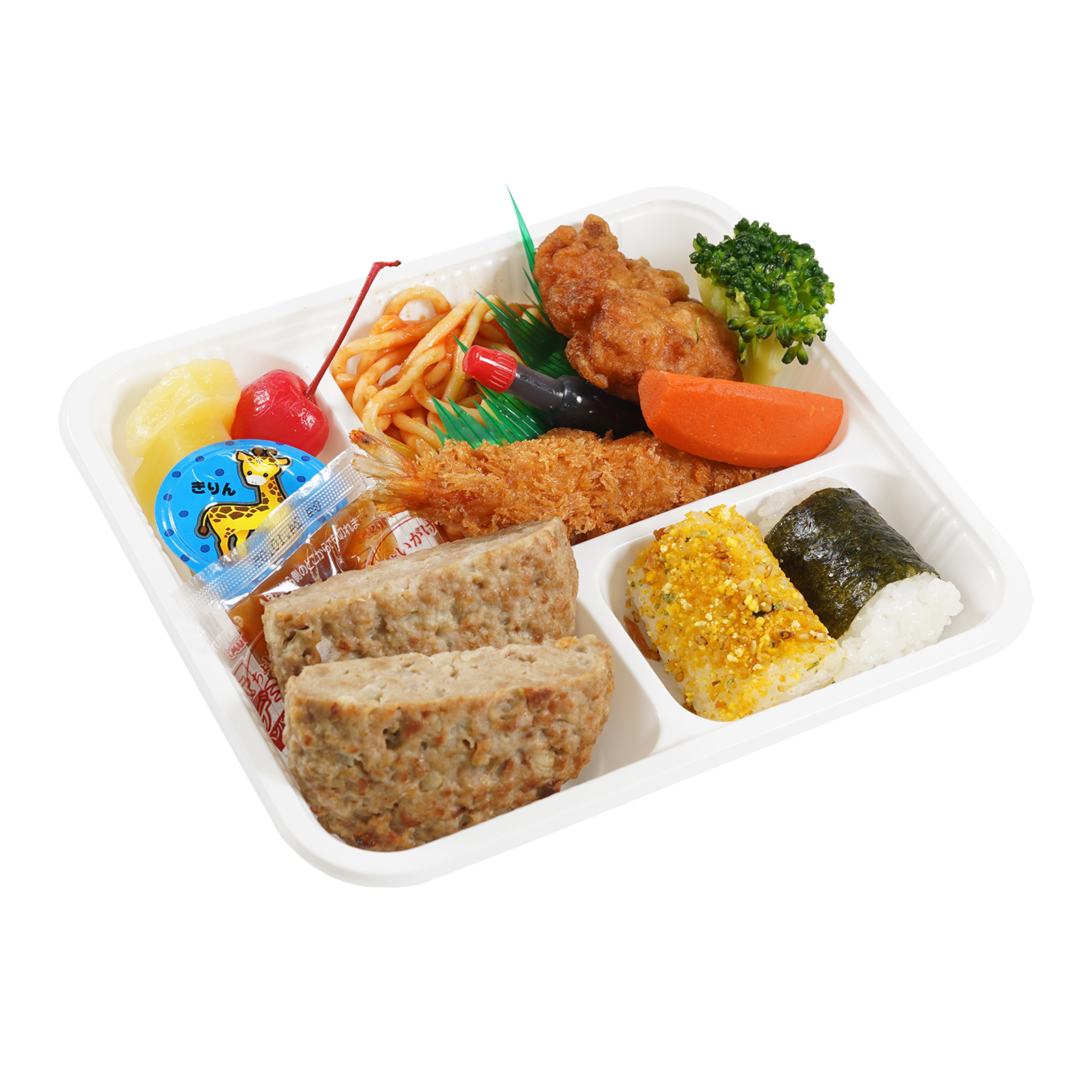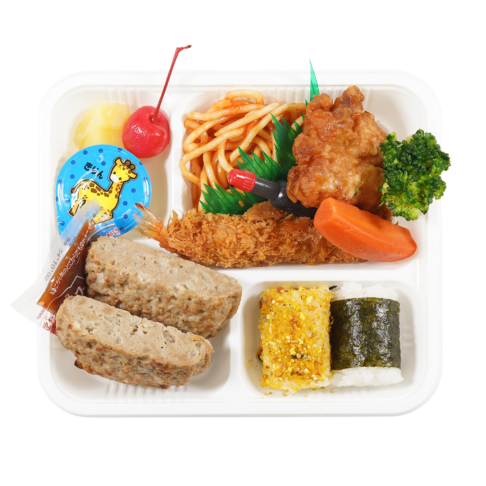 白ご飯(たまごふりかけ・焼海苔・黒胡麻)、海老フライ、鶏唐揚げ、イタリアンスパゲッティ、ハンバーグ(デミソース付)、ブロッコリー煮、人参煮、フルーツ(チェリー・パイン)、ゼリー